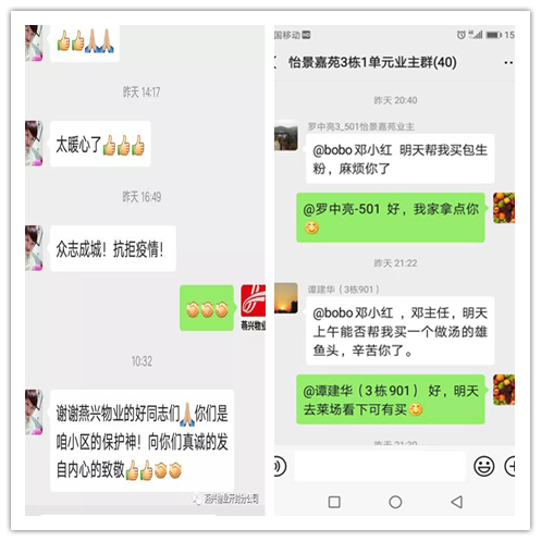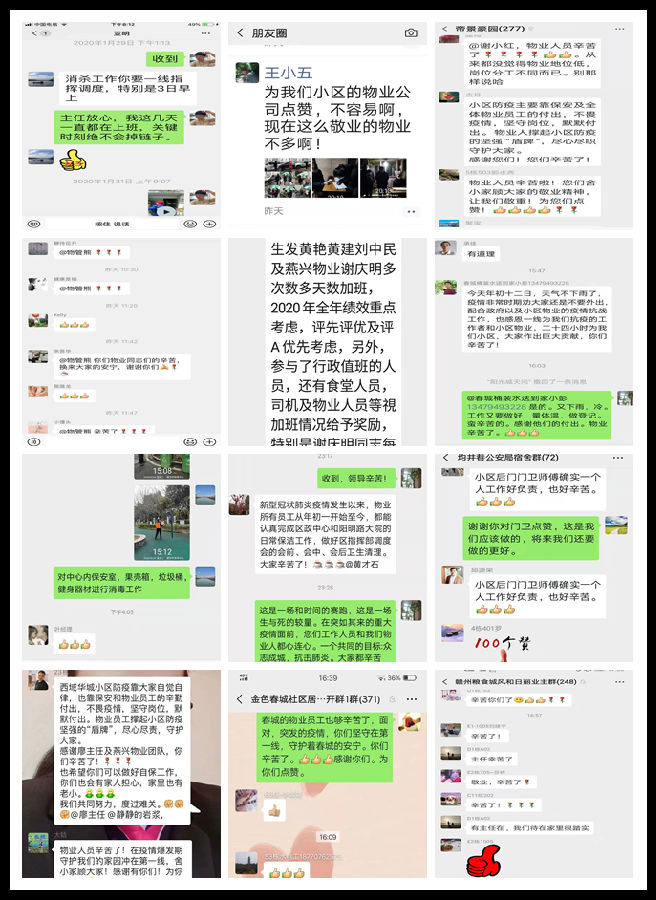 疫情當(dāng)前,燕興人不負(fù)使命,堅(jiān)守崗位,持續(xù)開展新型肺炎防控工作,和廣大業(yè)主一起打贏這場(chǎng)防控狙擊戰(zhàn)。我們的努力付出也獲得了上級(jí)領(lǐng)導(dǎo)、業(yè)主單位及眾多業(yè)主的好評(píng),業(yè)主群里點(diǎn)贊聲不斷;我們的合理倡議、規(guī)范作業(yè),業(yè)主總能理解并積極配合;我們守護(hù)業(yè)主的生命安全,業(yè)主也在用行動(dòng)為我們點(diǎn)贊加油!