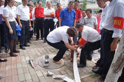 為了確保消防安全演練活動落到實處,讓大家正確掌握使用滅火器、消火栓的方法,火災(zāi)現(xiàn)場副總指揮吳志軍經(jīng)理將大家集合在一起,對滅火器、消防栓的操作方法進(jìn)行了詳細(xì)講解,公司總經(jīng)理劉南斗也親自做了水帶連接示范動作,各項目管理人員先后涌躍地親手操作了滅火器和水帶、水槍的連接。