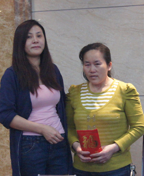 公司董事長劉燕將善款交到市政中心保潔員劉堯玉手中