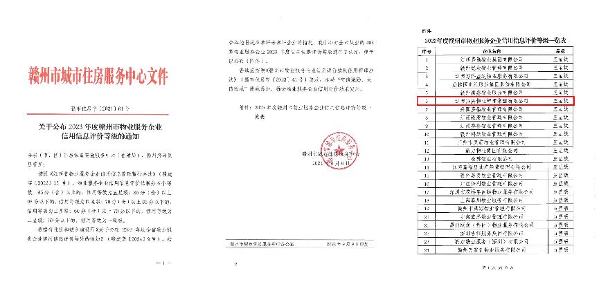 2024年9月9日,贛州市城市住房服務(wù)中心辦公室下發(fā)了《關(guān)于公布2023年度贛州市物業(yè)服務(wù)企業(yè)信用信息評價等級的通知》,市城市住房服務(wù)中心對全市從業(yè)的404家物業(yè)服務(wù)企業(yè)2023年度信用信息評價等級進(jìn)行了認(rèn)定,江西燕興物業(yè)管理集團(tuán)有限公司被認(rèn)定為五星級!