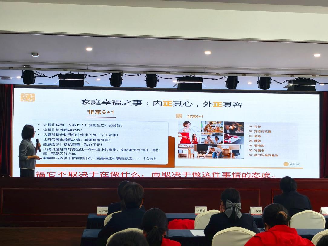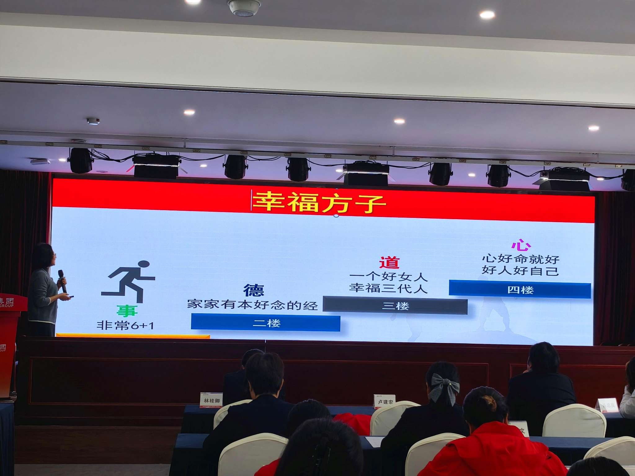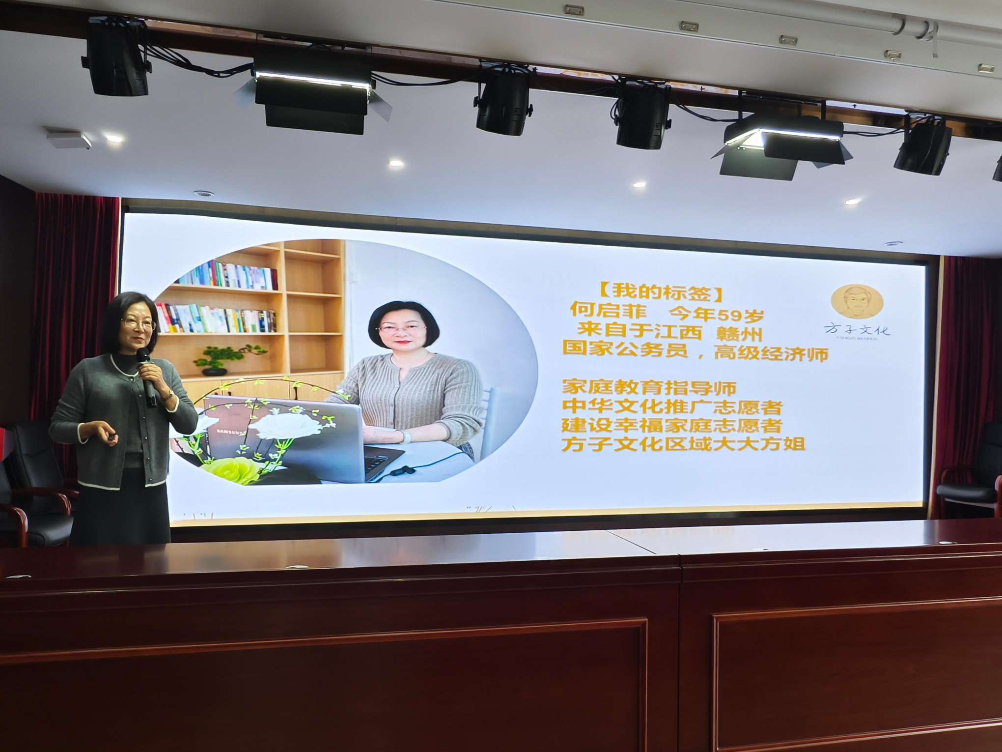 本次讀書分享會邀請了何啟菲老師為大家宣講。何啟菲老師是江西贛州人、國家公務(wù)員、高級經(jīng)濟(jì)師、家庭教育指導(dǎo)師,中華文化推廣志愿者、建設(shè)幸福家庭志愿者、方子文化區(qū)域大大方姐。分享會上,溫柔的何老師娓娓道來,結(jié)合自己家庭的故事,從打造“幸福方子”——事(非常6+1)、德(家家有本好念的經(jīng))、道(一個(gè)好女人,幸福三代人)、心(心好命就好,好人好自己)四個(gè)層面,圍繞《愛與陪伴》的實(shí)踐,就如何建設(shè)婆媳關(guān)系、夫妻關(guān)系、親子關(guān)系等家庭問題,分享了建設(shè)幸福家庭的方法與心法。